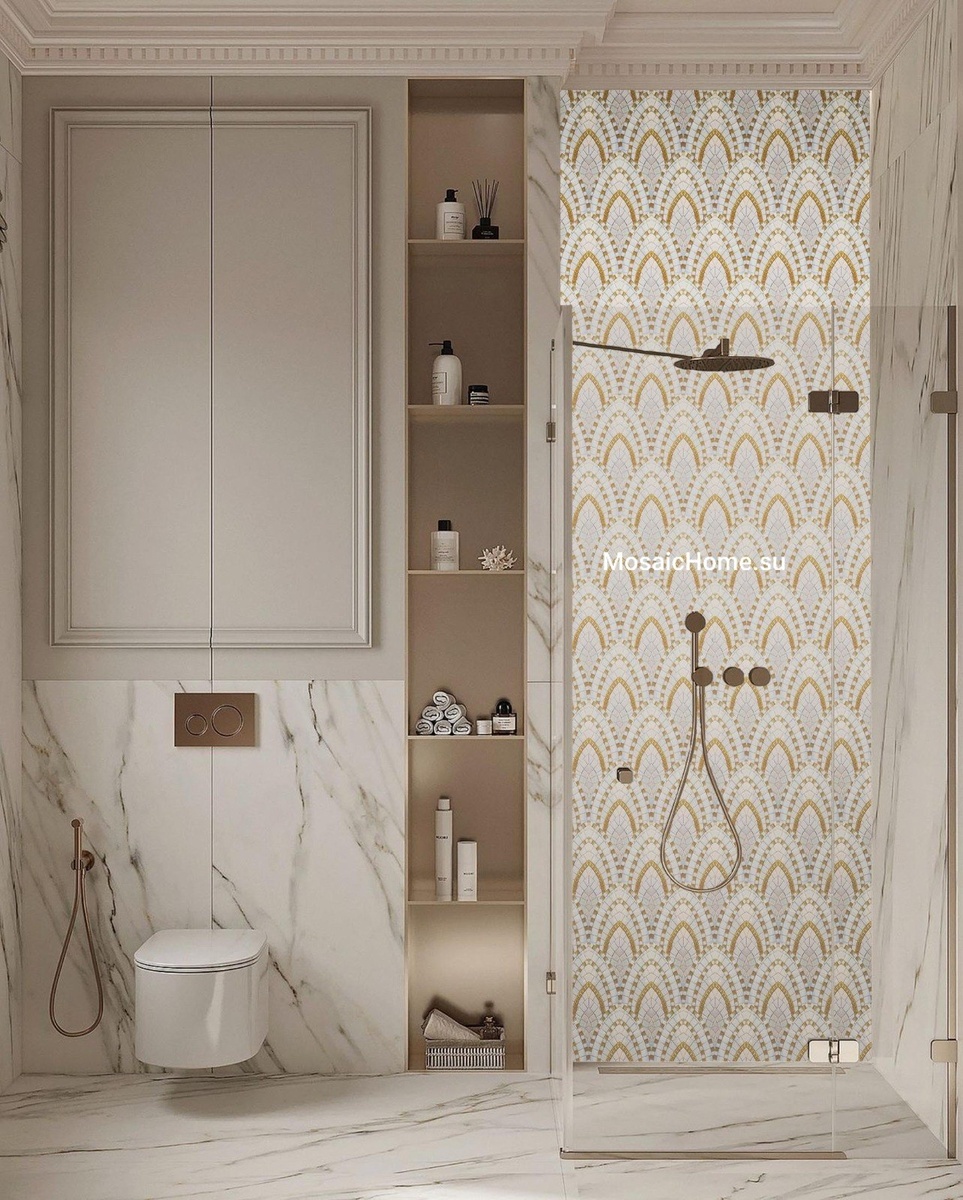 Панно для оформления зоны душевой Сочетание белого и золота в искусстве традиционно ассоциируется с элегантностью, роскошью и утонченностью. Белый цвет символизирует чистоту, свет и духовность, тогда как золото олицетворяет богатство, величие и власть. Вместе они создают ощущение гармонии. Арки из белой смальтированной мозаики с золотым акцентом, мозаика для Вашего сан.узла