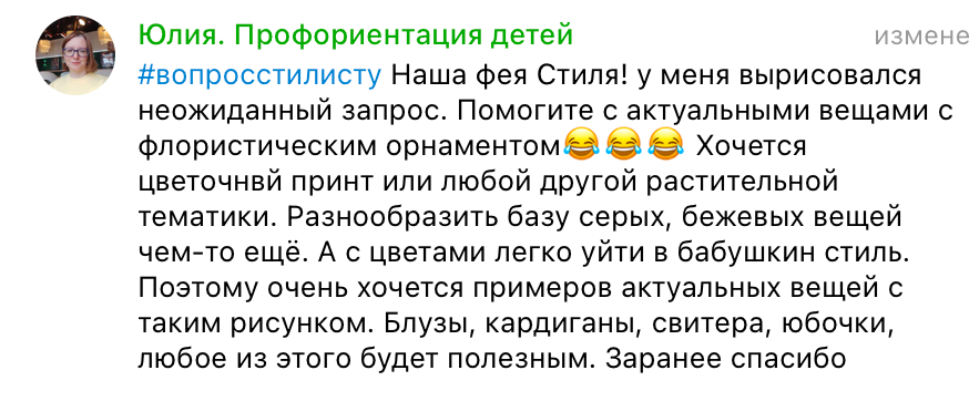 ✔️внешность (есть те, кому максимально органичен флористичный принт, а есть те-кому он не гармоничен)