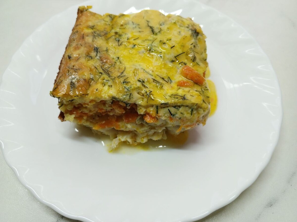 Для этой запеканки нужно филе рыбы без костей. Я использую филе судака, а точнее, 2-х среднего размера. Запеканка готовится быстро, всего 20 минут в духовке при 180°С. Но подготовка все же требуется. Список и количество ингредиентов Вы найдете в конце статьи⤵! Сначала нужно подготовить "шубу": обжарить на сковороде в масле (растительное+сливочное) до румяности мелко нарезанный лук и натертую на крупной терке морковь с добавлением соли, сахара (совсем немного) и специй. Я в последнее время не обжариваю лук с морковью, а просто выкладываю на сковороду с маслом или в кастрюлю и закрываю крышкой. Тушу на слабом огне, если начинается процесс обжаривания, то подливаю 1/4 стакана воды. И продолжаю тушить под крышкой на слабом огне практически до готовности. Так поступаю и при приготовлении супов, борщей и др. блюд. Заливка тоже готовится очень быстро: яйца взбиваются с солью, добавляется сметана, зелень, натертый на крупной терке сыр. Теперь надо все собрать: филе рыбы нарезать кусочками
