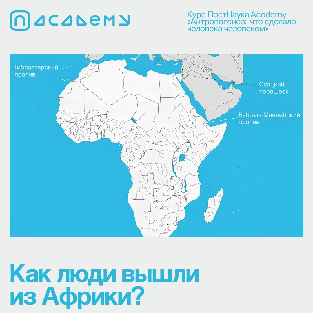 Выход из Африки теоретически мог осуществляться тремя путями: 1) через Баб-эль-Мандебский пролив; 2) через Суэцкий перешеек; 3) через Гибралтарский пролив. Первый вариант наиболее вероятен, хотя предполагает преодоление пролива шириной в несколько километров. Разбираем другие варианты и то, как шло расселение дальше, в одном из уроков курса Академии ПостНауки «Антропогенез»: https://postnauka.org/link/evolution_tg.