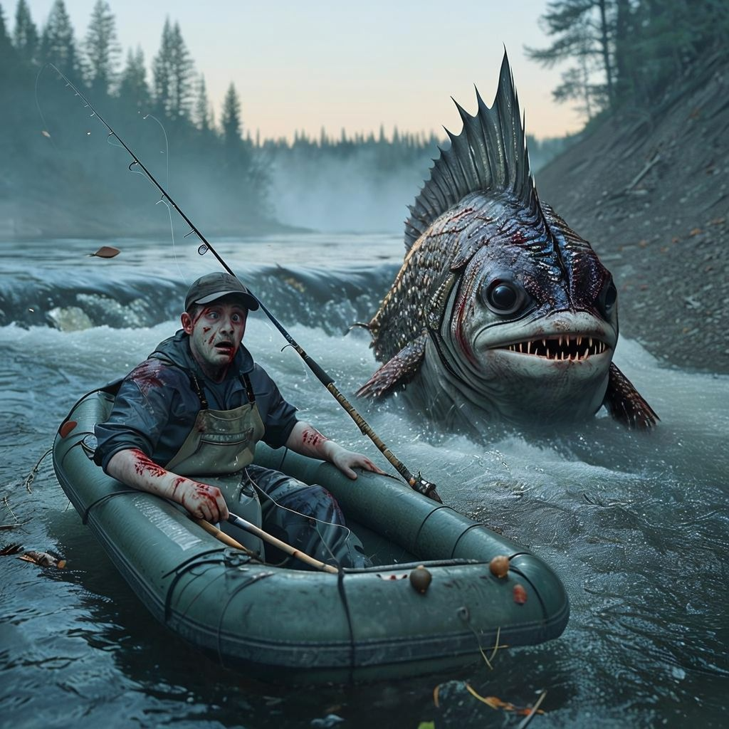 Рыба дернулась и вновь ушла в глубину и я, чуть замешкавшись, едва не упустил удочку из рук. «Ладно, черт с тобой»,-подумал я. Но, поиграть нам не довелось. Потому ,что у самого борта лодки неожиданно всплыла на поверхность еще одна тварь - полная копия первой. На меня уставились, как перископы, ее злобные глаза. Я не страдаю больным воображением и психическими отклонениями, но это были на самом деле две черные, не мигающие дырки, мерцающие каким-то дьявольским мраком, словно пытающиеся загипнотизировать. Рыба, не производила ни каких движений, и, было не совсем понятно, как ей при всем этом, удается держаться на поверхности. Хорошо известно, что любое тело, уходя под воду, издает мало-мальски какой-то шум или всплеск, это же полуметровая субмарина, в точности повторила маневр подлодки, а именно, она медленно и бесшумно произвела погружение. Через некоторое время я очнулся от этого наваждения и возобновил попытку все-таки выудить первую рыбу. Наверное, не случайно у меня это выходило менее уверенно. Но на этом чудеса не закончились, т.к. именно в следующее мгновение меня атаковали. Бесшумно торпедировав из воды, с распахнутым как парус плавником, подобно боевому стягу. Вторая рыба в полете, всем своим корпусом, ударила меня по рукам, выбив удочку из моих рук, потом бесшумно ушла под воду, описав молниеносную дугу над лодкой. Я же, в отличие от нее громко упал и раскорячился в лодке, в непонятной позе. Это было настолько неожиданно, что у меня отвисла челюсть. Не скрою, в тот момент я был сильно напуган.