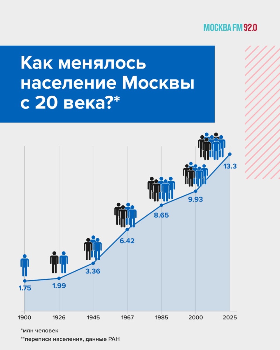 📈 В мае население Москвы превысило 13 300 000 человек Утром мы обсуждали, что среди них — только 5% коренных жителей столицы. Выходит, Москва не была бы такой густонаселённой, если бы не жители из других регионов. В начале 20-го века в столице жили около миллиона человек, а сейчас — больше 13-ти. Это понятно, что коренных москвичей меньше: в семьях было по одному, по два ребёнка, население само себя не воспроизводило так активно. Кстати, люди, которые переезжают на новое место жительства, заводят статистически больше детей. Потому что они не боятся перемен в жизни. Те, кто вообще не переезжает, часто остаются холостыми — они просто по характеру не хотят в своей жизни что-то менять, опасаются, — считает профессор социологии Александр Синельников. Кстати, судя по опросу, больше половины наших подписчиков — коренные москвичи, а 37% по-настоящему гордятся этим. 📌 Подписаться на Москва FM / Наш чат-бот / Мы в MAX
