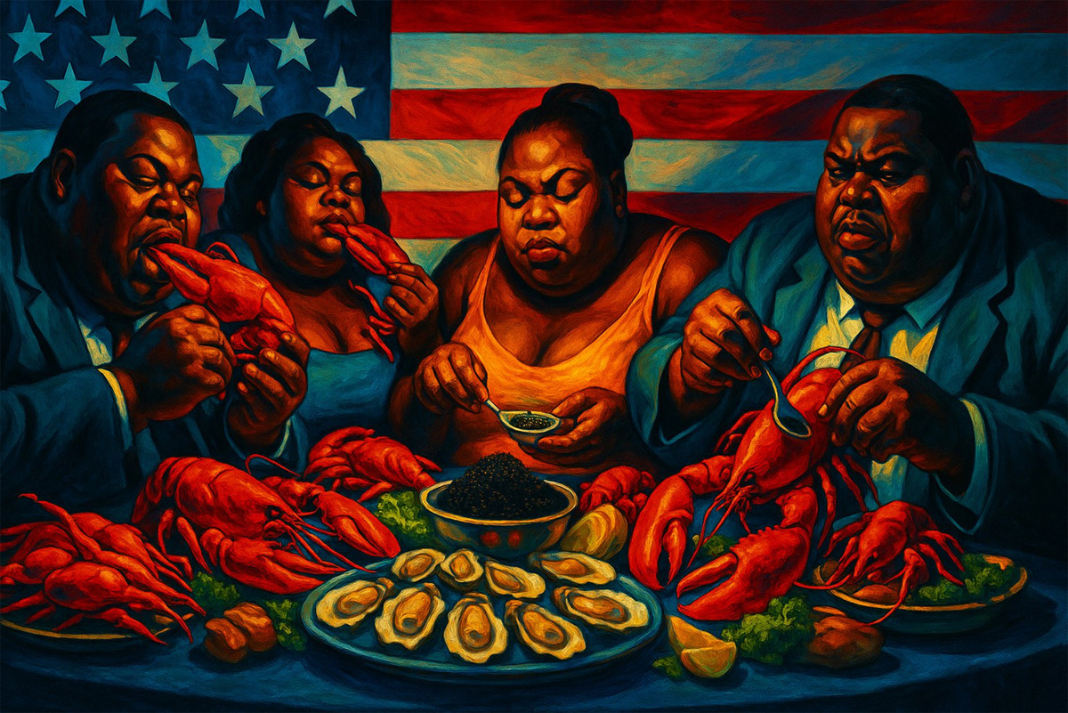Американская культурная и политическая жизнь построена на обожании местных негров, так что и продуктовые карточки – а ими испокон века (эта система началась в 1960-х) пользуются именно «бро» и «хоумиз» – дают им огромный простор для кулинарного творчества. На «Амазоне», к примеру, на привязанную к специальному продуктовому счёту карту можно купить омаров и прочие деликатесы, большинство публики используют халявные деньги для здорового питания чипсами и газировкой (отсюда и стереотип о том, что ожирение – болезнь бедноты), а многочисленные «новые американцы» получают деньги на продуктовые счета даже будучи вполне себе обеспеченными – точно так же, как у нас иной владелец припаркованного поперёк тротуара «Лексуса» без номеров числится безработным многодетным инвалидом.