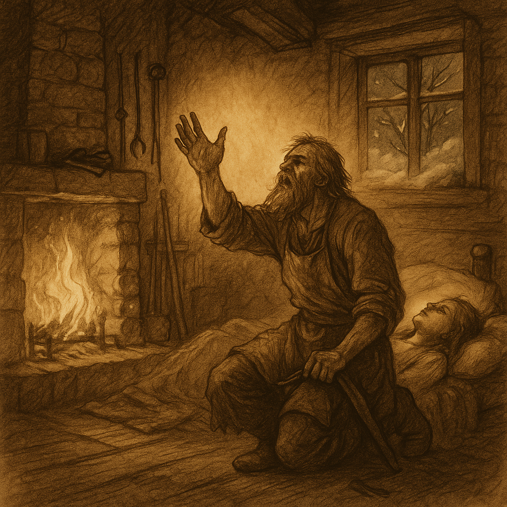 Одной тёмной-тёмной безлунной ночью, на краю одного тёмного-тёмного и бескрайнего леса-великана в тёмной-тёмной избушке горел яркий свет, броским лучом извергаясь из маленького оконца. Здесь живут кузнец со своей благоверной. Или жили… Скоро узнаем.