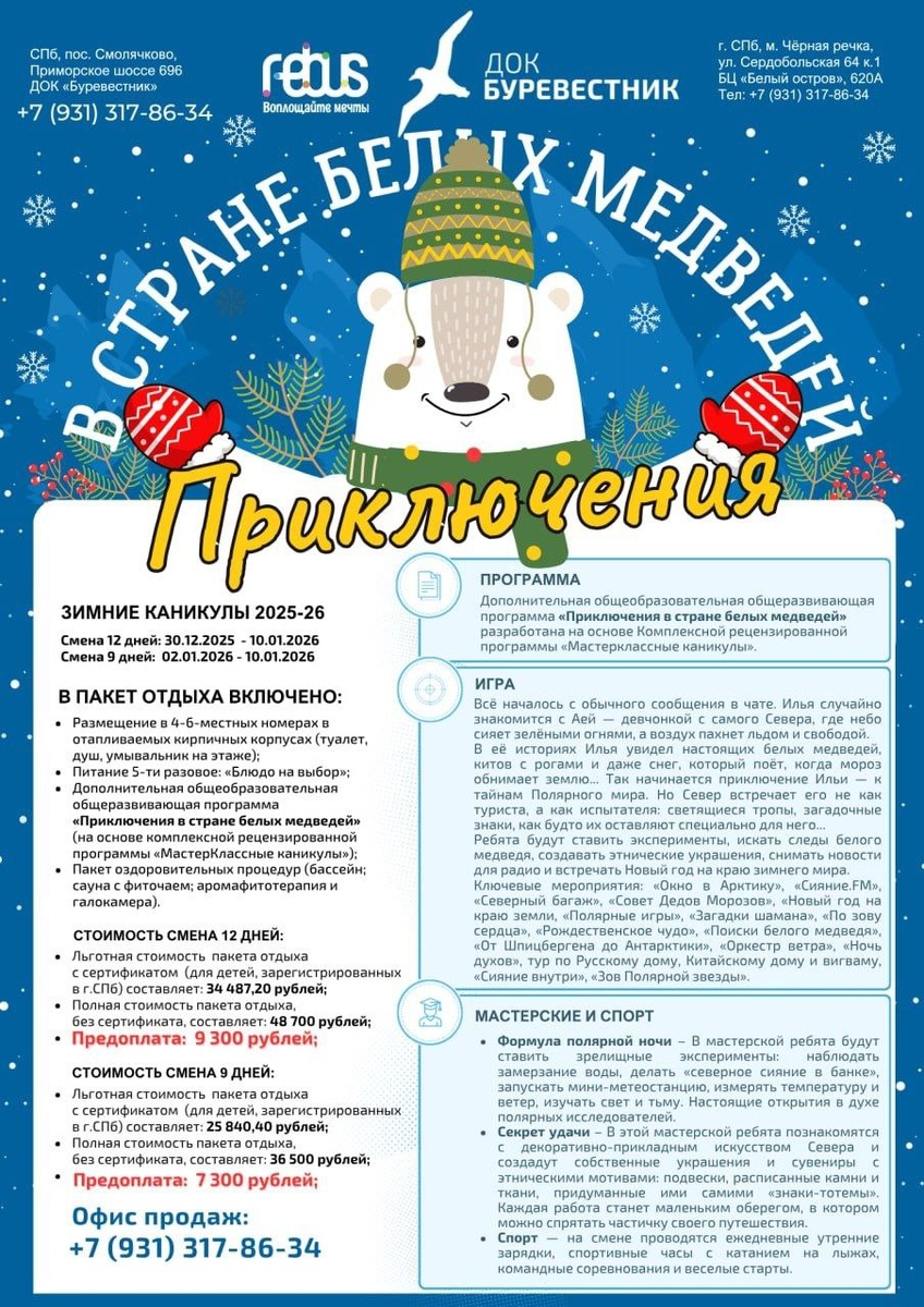 Незабываемые зимние каникулы в стране белых медведей! 🎄 Приглашаем отдыхающих и организованные коллективы на незабываемые зимние каникулы в ДОК «Буревестник»! Это будет настоящее новогоднее путешествие, полное загадок, открытий и волшебства ✨ 1⃣ «Приключения в стране белых медведей» На смене ребята станут участниками увлекательного квеста: их ждут научные эксперименты с северным сиянием и льдом, творческие мастер-классы по созданию этнических украшений, поиски следов белого медведя, съёмки репортажей для постановочного радио и празднование Нового года в атмосфере полярной романтики с уникальными мероприятиями — от «Совета Дедов Морозов» до «Ночи духов» и «Зова Полярной звезды». Детей ждёт полное погружение в атмосферу Севера: — Научные эксперименты с северным сиянием и метеостанцией — Мастер-классы по созданию этнических украшений и оберегов — Ежедневные спортивные активности и оздоровительные процедуры Выберите подходящую смену: ❄ 12-дневная (30.12.2025-10.01.2026) — полное погру