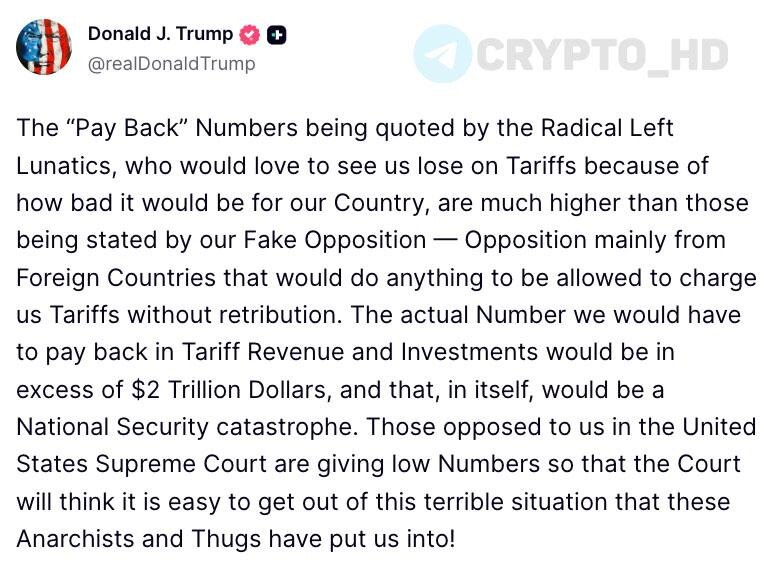 ❌🇺🇸 Дональд Трамп заявил, что США придется вернуть $2,000,000,000,000, если Верховный суд признает тарифы незаконными. Ранее: - разрушительные последствия - решение к концу года - суд отменит пошлины - суд проявил скепсис - «вопрос жизни и смерти» Crypto Headlines