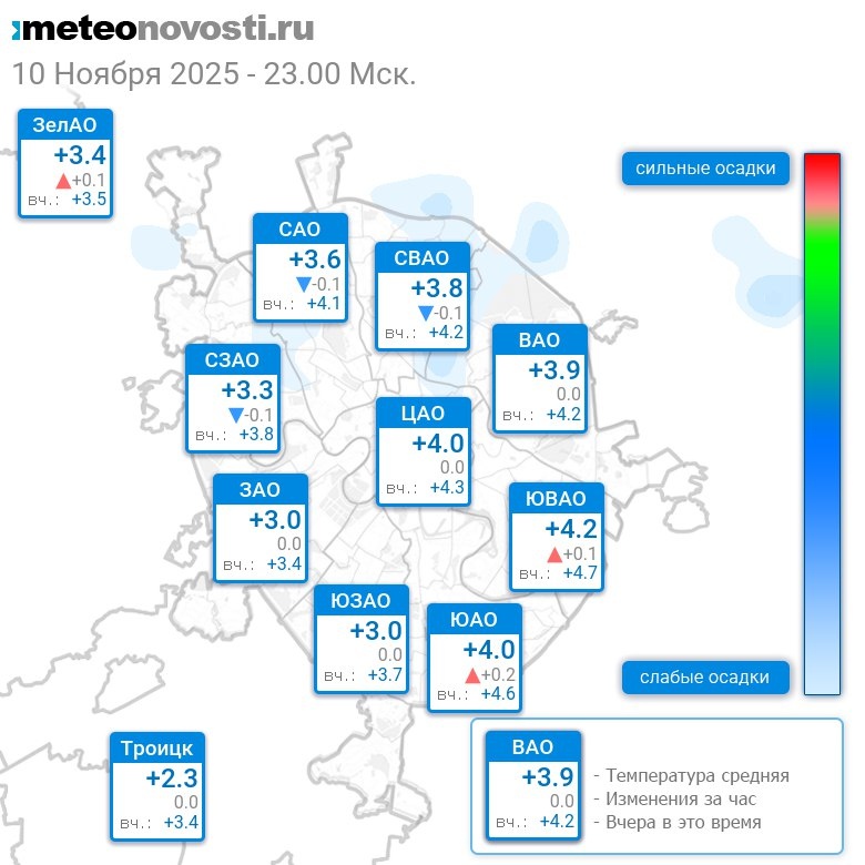 В 23:00 в Москве было от +2.1°C до +4.3°C, средняя температура +3.6°C #погода #Москва #осень #температура #10ноября #понедельник