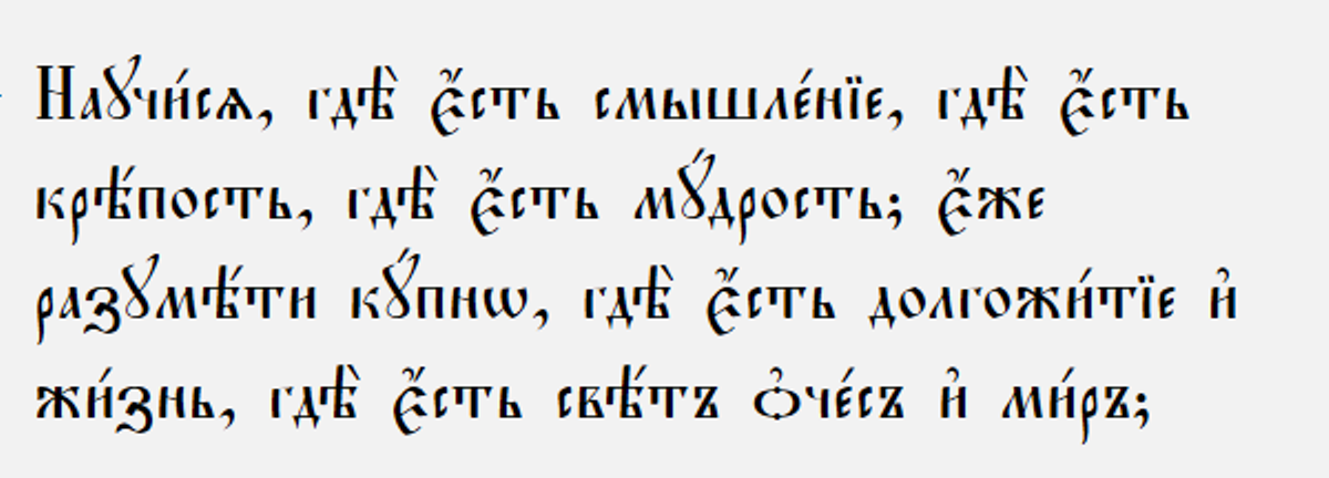 Когда пытаешься выучить иностранный язык романо-германской группы, и это даётся с большим трудом, то сначала лучше бы обратиться к древнеславянскому языку, точнее, церковно-славянскому, поскольку он ближе и понятнее. Например, научиться читать на нём тексты и понимать то, что написано. А порой, хотя бы просто читать. Уверяю, сразу станет намного легче понять и запомнить иностранные слова, поскольку, все они прямо или косвенно всего лишь искажённая копия древнеславянских слов. А если копнуть глубже, то родословная этих языков - санскрит. Кстати, как оказалось, церковно-славянский язык даётся чрезвычайно легко в произношении и понимании слов. Читается этот текст, следующим образом: «Научися, где есть смышление, где есть крепость, где есть мудрость, еже разумети купно, где есть долгожитие и жизнь, где есть свет очес и миръ?» А перевод на современный русский язык звучит примерно так: «Познай, где находится мудрость, где с