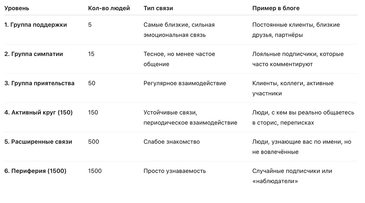 Чтобы понять, как укреплять отношения с подписчиками, нужно рассмотреть шесть слоёв модели Данбара.