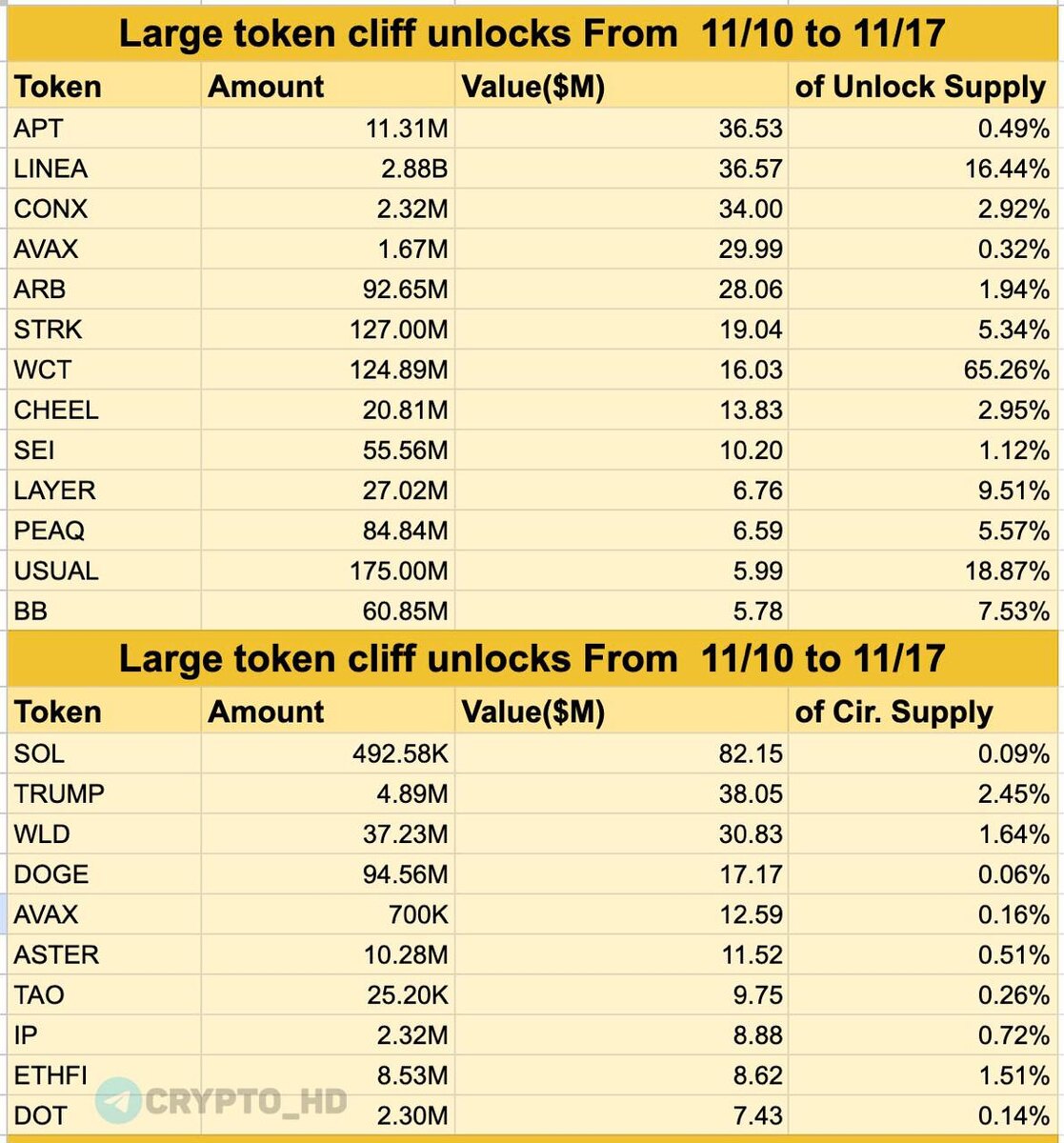 #анлок 🔓 ТОП разблокировок токенов с 10 по 17 ноября! Cliff Unlocks: ▫️#APT – $36,53m ▫️#LINEA – $36,57m ▫️#CONX – $34,00m ▫️#AVAX – $29,99m ▫️#ARB – $28,06m ▫️#STRK – $19,04m ▫️#WCT – $16,03m ▫️#CHEEL – $13,83m ▫️#SEI – $10,20m ▫️#LAYER – $6,76m ▫️#PEAQ – $6,59m ▫️#USUAL – $5,99m ▫️#BB – $5,78m Linear Unlocks: ▫️#SOL – $82,15m ▫️#TRUMP – $38,05m ▫️#WLD – $30,83m ▫️#DOGE – $17,17m ▫️#AVAX – $12,59m ▫️#ASTER – $11,52m ▫️#TAO – $9,75m ▫️#IP – $8,88m ▫️#ETHFI – $8,62m ▫️#DOT – $7,43m P.S. Cliff Unlocks – разблокировка крупной порции токенов единовременно в конкретную дату. Linear Unlocks – постепенная разблокировка токенов в течение определенного периода (обычно каждый день или каждую неделю по части). Crypto Headlines