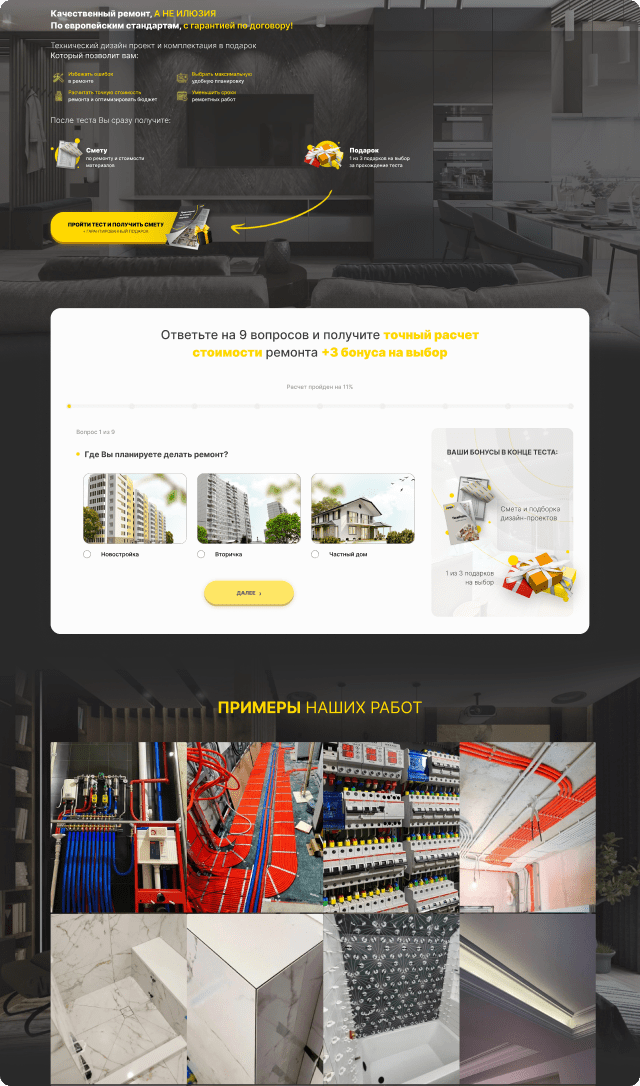 Далее я уже разработал большой сайт, где внедрил новые блоки, примеры работ, чек-лист “Хотите сэкономить до 30% от стоимости ремонта?” в формате PDF.