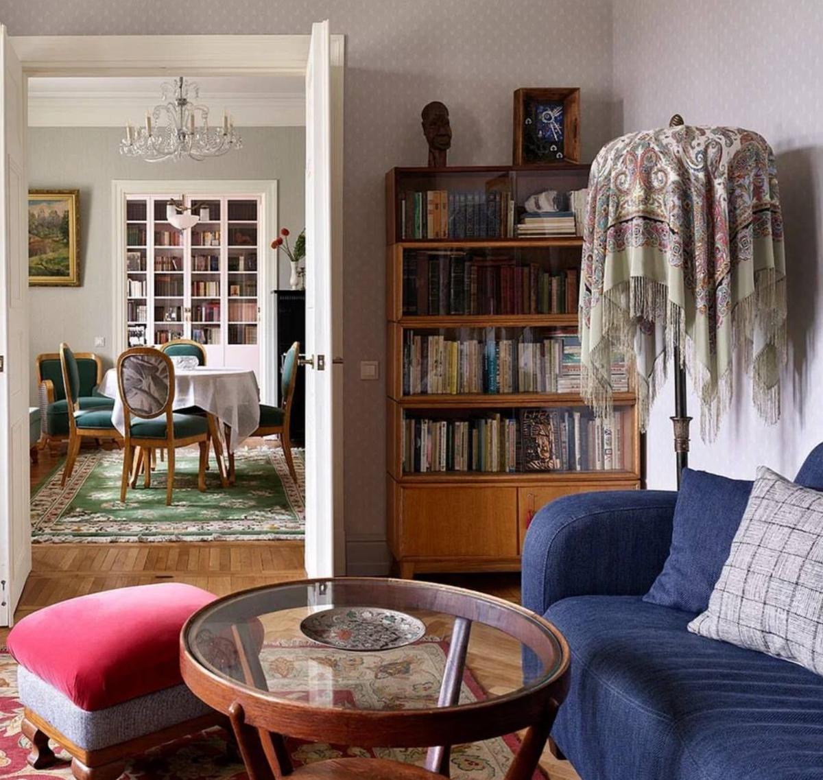 Множество маленьких деталей, плавно отсылающих в прошлое: массивные лампы, стильные ковры и дерево. На фоне пастельных тонов в отделке – смелые яркие оттенки в текстиле.