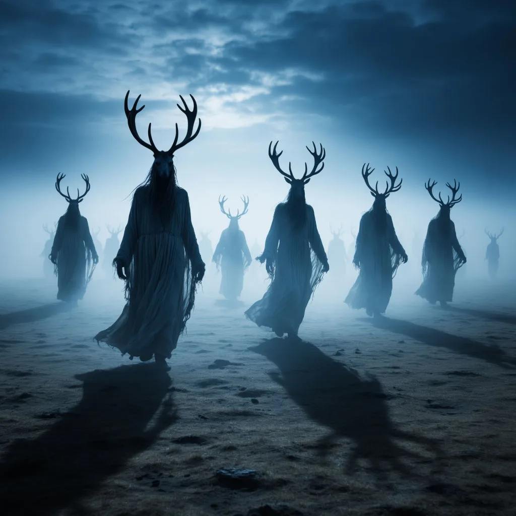 Они не были из плоти и крови. Это были тени, силуэты, сотканные из того же голубоватого сияния. Одни напоминали людей в длинных одеждах, другие — фантастических зверей, оленей-гривастей с ветвистыми рогами, как на тех самых «оленных» камнях. Они медленно двигались по степи, беззвучно скользя над землёй. Их были десятки, сотни. Целый хоровод призраков, вышедших из-под векового льда.