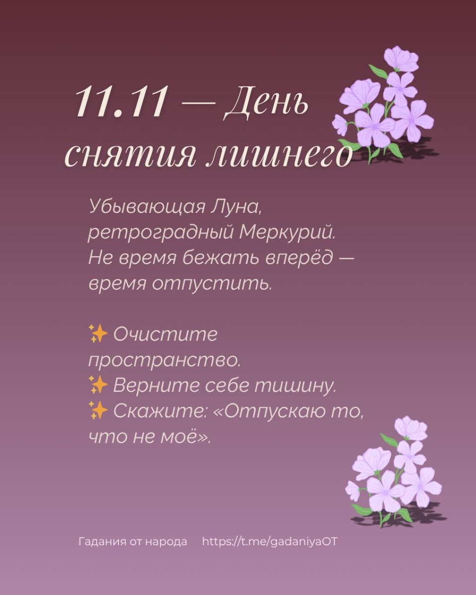 Сегодня Луна — в фазе убывающего серпа. Это время, когда энергия выводится и помогает отпустить лишнее. Также Меркурий уже в ретрограде с 9 ноября — хорошее время не начинать новое, а распутывать старое. Совет на сегодня: 1️⃣ Найдите минуту-другую: выключите телефон, глубоко вдохните. 2️⃣ Встаньте у порога своего дома и скажите вслух: «Отпускаю то, что не моё. Принимаю то, что храню.» 3️⃣ Держите в руке монету или маленький талисман. Пройдите три раза по комнате по часовой стрелке, представляя, что следом за вами остаётся свет и спокойствие. Затем оставьте предмет в доме или в кошельке — пусть хранит это, защищая вас. 4️⃣ На вечер: не планируйте новых дел. Запишите на листке только одно слово — «спокойствие», «дом», «я». Сложите лист и положите рядом с подушкой. Вывод: Сегодня не день «успеть всё». Сегодня день — «освободиться от лишнего». Когда убавляется луна и заторможен Меркурий — лучший ход: “снять”, а не “накрутить”.