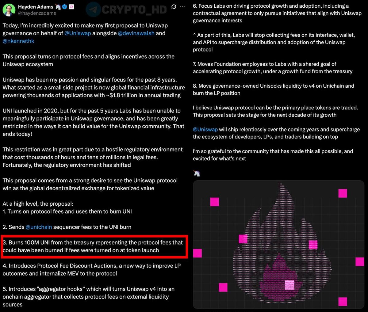🔥 #UNI CEO Uniswap предлагает разово сжечь 100,000,000 UNI ($900m) – twitter ➠ Это дополнение к недавнему предложению: UNIfication ➠ Расширенная версия поста CEO Uniswap: ссылка Crypto Headlines