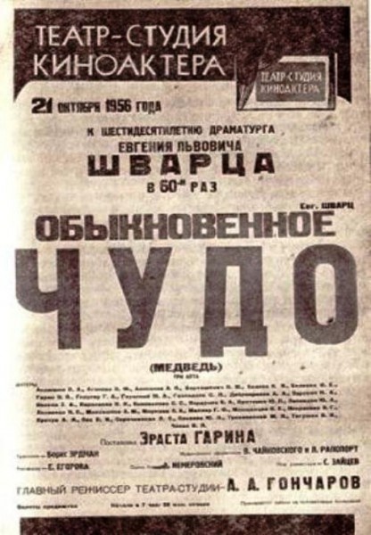 21 Октября 1956 года совпали два события. Евгению Шварцу исполнялось 60 лет и на сцене театра шел шестидесятый показ спектакля «Обыкновенное чудо». Эраст Гарин пишет: «Осенью Е. Л. Шварц отмечал свое шестидесятилетие. У нас в Театре киноактера в день его рождения шел шестидесятый спектакль. Мы выпустили специальную афишу: «К шестидесятилетию драматурга Евгения Львовича Шварца. В 60-й раз “Обыкновенное чудо”».