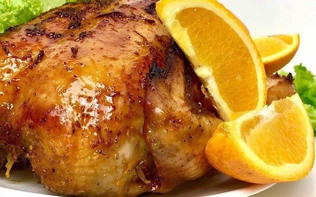 6. Форму для выпечки промазываем растительным маслом. Выкладываем сюда курицу, на спинку. Апельсины очищаем, нарезаем ломтиками. Ими фаршируем нашу курочку. Сверху поливаем тем соусом, в котором она мариновалась.