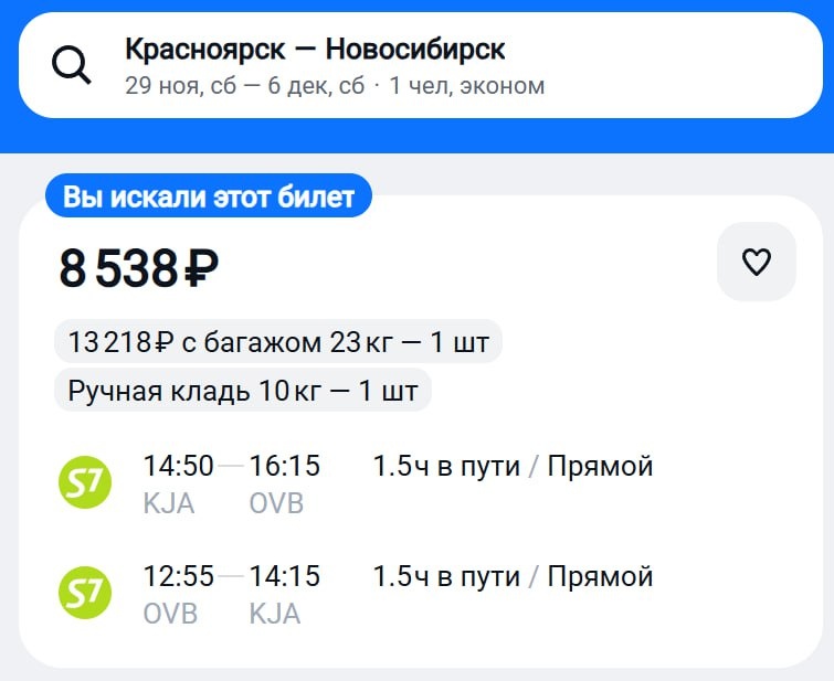 🛩 Долгожданная распродажа S7! 🛒 Покупаем: до 23:59 МСК 13 ноября ✈️ Летаем: с 17 ноября Всё как всегда — обещают скидки до -50% на все направления. Интересного для нас как всегда не много, но чем богаты 🤷 ➡️ Из Красноярска: 📍Новосибирск — 8 538 ₽ (29.11-06.12) https://aviasales.tpm.lv/8Iw9mCZU 📍Иркутск — 9 054 ₽ (18.11-10.12) https://aviasales.tpm.lv/CAy5D6Wy ➡️ Из Абакана: 📍Москва — 15 442 ₽ (23.11-13.12) https://aviasales.tpm.lv/r285XNjT 📍Новосибирск — 9 960 ₽ (20.11-13.12) https://aviasales.tpm.lv/N9X0F79f 📍Иркутск — 6 900 ₽ (27.11-04.12) https://aviasales.tpm.lv/9W0EaBAP ➡️ Из Новосибирска: 🇦🇪 Дубай — 16 299 ₽ (17.12-01.01) https://aviasales.tpm.lv/aTRhVLYb 🇰🇿 Алматы — 15 943 ₽ (13.12-14.12) https://aviasales.tpm.lv/uC9ArZef 🇰🇿 Астана — 10 292 ₽ (05.12-08.12) https://aviasales.tpm.lv/Ny3vNABU 🇹🇷 Стамбул — 29 146 ₽ (25.11-02.12) https://aviasales.tpm.lv/MvOt1I6f 🇹🇷 Анталья — 27 546 ₽ (05.12-12.12) https://aviasales.tpm.lv/g1IjItV6 🇷🇺 Москва — 13 666