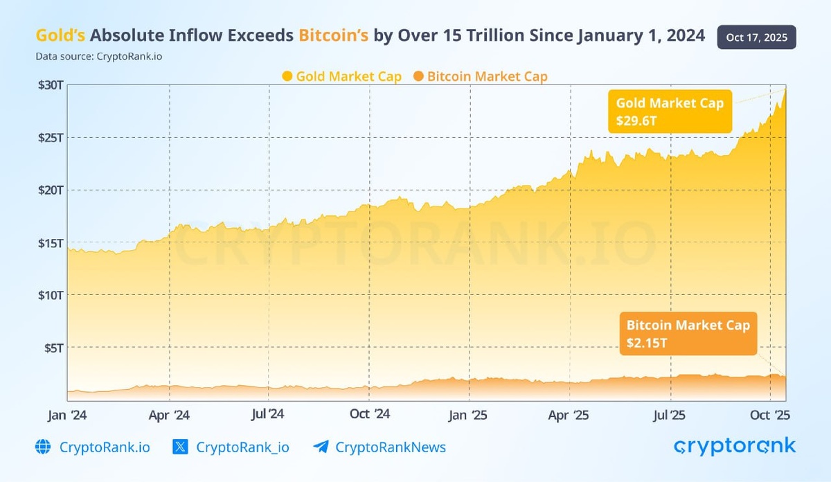 🎉💰 Since Jan 1, 2024, gold's market cap has skyrocketed to a whopping $29.6 TRILLION, outpacing Bitcoin's rise to $2.15 TRILLION by over $15 trillion! 🤯 Even with crypto making waves in finance, gold still reigns as the go-to safe-haven asset when markets get rocky. 🛡✨ But wait, there's more! Tokenized commodities like Tether Gold (XAUT), PAX Gold (PAXG), and AurusGOLD (AWG) are joining the party, giving investors cool on-chain access to gold and other shiny metals. 🚀🔗 Who knew safety could be so trendy? #GoldStandard #CryptoCrossover