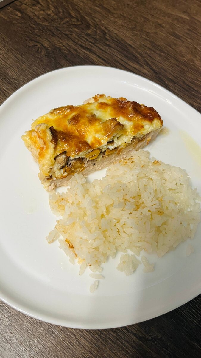 Нарезаем лук и обжариваем вместе с грибами (у меня замороженные лисички). Выкладываем сверху на мясо.