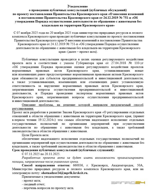 🔴🔴🔴 Власти Красноярского края объявили публичные обсуждения по эвтаназии собак после трагедии в Березовке Правительство Красноярского края опубликовало проект документа, который вводит изменения в порядок по обращению с животными и позволит умерщвлять безнадзорных собак. Эксперты Министерства природных ресурсов и лесного хозяйства края, которые готовили поправки, пишут, что они направлены на предотвращение эпидемий, защиту жителей от нападений собак, а также на обеспечение гуманного отношения к этим животным. Как пишут авторы проекта, эвтаназию в отношении безнадзорных животных будут использовать только в случаях: - при выявлении неизлечимого заболевания или травм, несовместимых с жизнью; - если будет документально подтвержден факт нападения собаки на человека; - при выявлении немотивированной агрессии; - если животное является переносчиком особо опасных заболеваний или их возбудителей. Кроме того, собак будет разрешено усыплять в случае установления в Красноярском крае или на