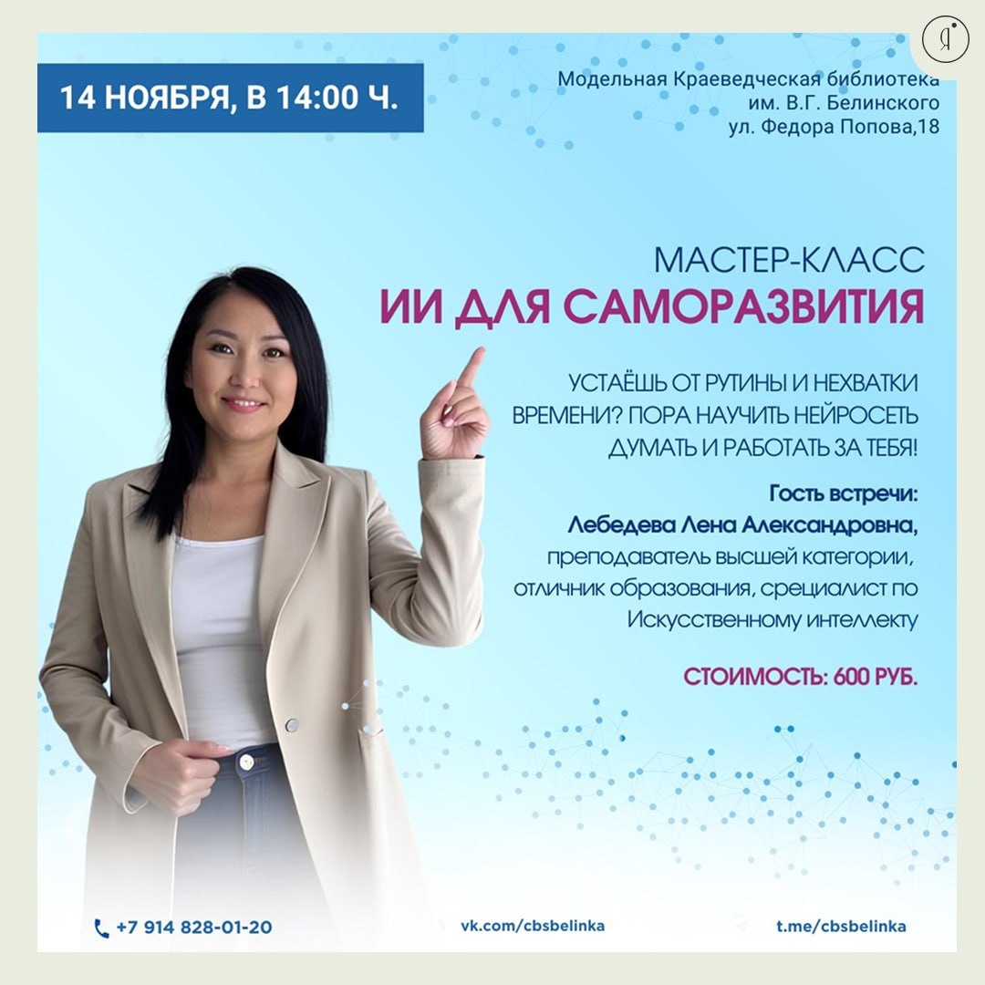 ИИ для саморазвития #АктивныйОтдых #ЗаГородом На мастер-классе расскажут: 🤩 Как использовать нейросети для учёбы, работы и хобби; 🤩 О простых и безопасных способах взаимодействия с ИИ; 🤩 Как экономить время и силы, получая больше вдохновения. Эксперт - Лебедева Лена Александровна, преподаватель высшей категории, отличник образования, специалист по искусственному интеллекту 14 ноября | 14:00 Библиотека ВГ Белинского, Ф.Попова, 18 600 руб. Справки и запись по номеру: 7 914 828-01-20 Online Якутия | Ждем вас в МАХ