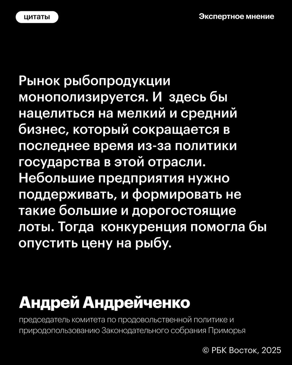 Депутат ЗСПК Андрей Андрейченко рассказал, что поможет сделать рыбу доступнее. 🔹 Финансирование отраслевой науки для более точных прогнозов вылова. 🔹Поддержка малого и среднего бизнеса. Небольшие и доступные по стоимости лоты на квоты помогут вернуть конкуренцию. 🔹Создание промысловых рынков, на которые рыбаки могли бы сдавать улов напрямую. Здесь продукция может быстро проходит контроль и поступать к покупателю. 🔹Стабильные правила для бизнеса. Постоянные изменения в системе квот и регулировании создают неопределенность. Предсказуемые условия дадут компаниям развиваться и удерживать цены на приемлемом уровне. 😃Подписывайтесь на РБК Восток