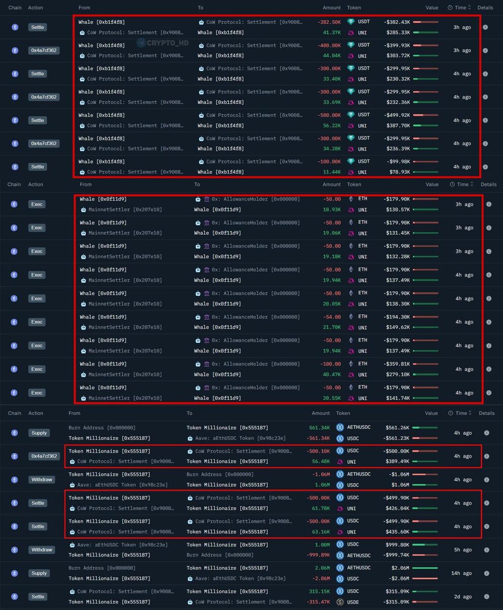 🐋 Киты начали накапливать #UNI ⊹ Инвестор «0xb1f» купил 254,441 UNI ($2,28m) по средней цене $8,97. ⊹ Кит «0x0f1» приобрел 199,818 UNI ($1,78m) по $8,92. ⊹ Трейдер «0x555» закупился 181,421 UNI ($1,5m) по $8,27. Ранее: предложение CEO Uniswap Crypto Headlines