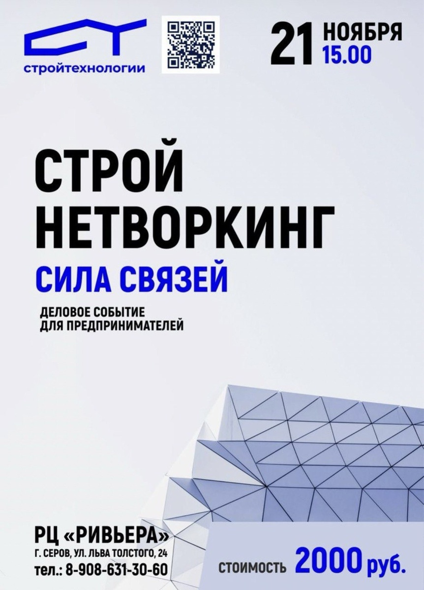 🔥 Откройте новые перспективы для развития своего бизнеса 🗃 «СтройНетворкинг — Сила связей»: уникальное деловое событие для предпринимателей и экспертов строительной отрасли, где мы обсудим вызовы ближайшего десятилетия, найдем пути развития и построим надежные деловые связи. 📌 Дата: 21 ноября 2025 года ⏳ Начало: 15:00 🏛 Адрес: г. Серов, ул. Льва Толстого, 24, РЦ «Ривьера» ▌ В программе мероприятия ✅ Панельная дискуссия «Вызовы 2026. Строим новые решения» ✅ Сильные спикеры отрасли ✅ Бизнес-игра «Строй-Конструктор» ✅ Обмен контактами с ключевыми игроками отрасли ✅ Нетворкинг и фуршет Предварительная регистрация обязательна. Контактный номер: +7-908-631-30-60 Елена