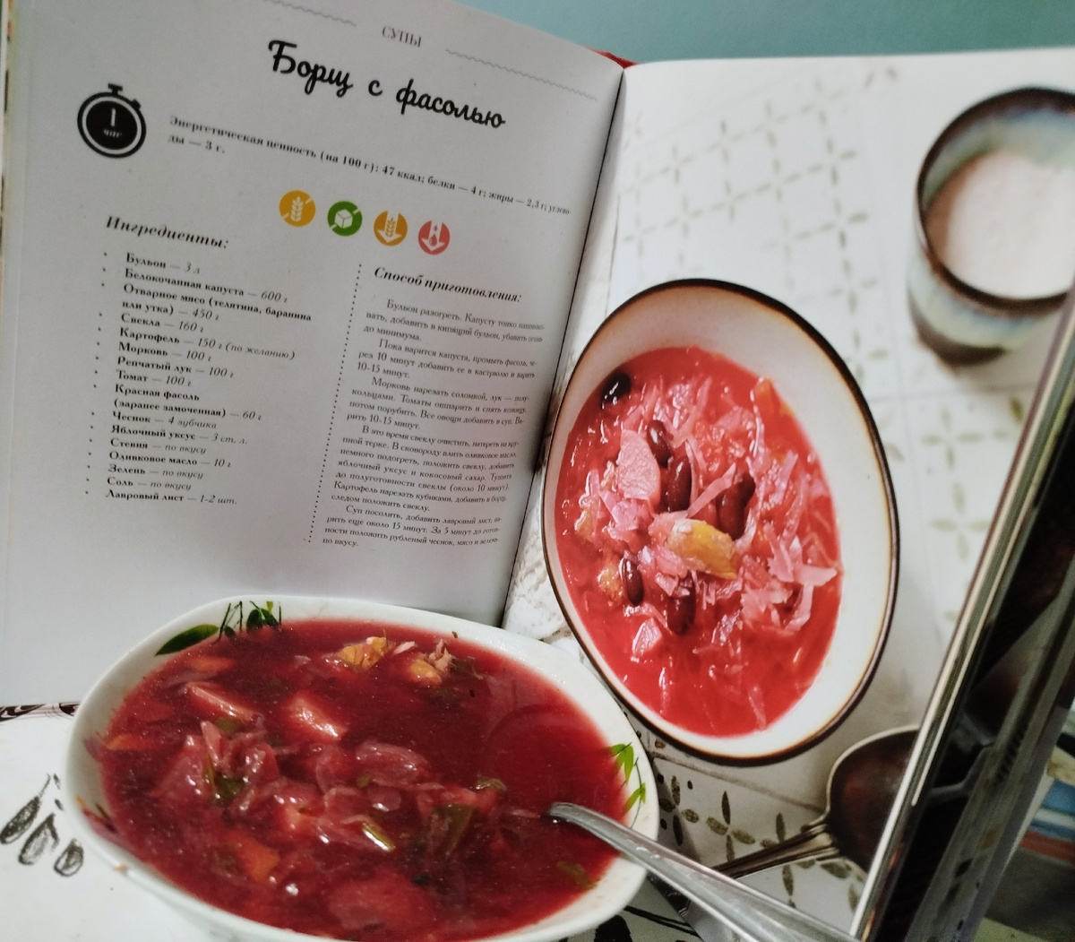 Ну это классика вообще! Как без борщеца да без сальца?! Такого сала с мясными прожилками, ням-ням 😋 Сюда и чесночок просится🤗 Борщ с фасолью да со сметанкой - сытный и вкусный 👌 Дак я его так и готовлю всегда, только без фасоли обычно и капусту в конце кладу с зеленью, 🥬 А так всё, как доктор (нутрициолог) прописал. Рецепт из "Чистого питания" Д. Савельевой и Д. Третьяковой.