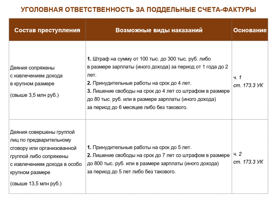 🧑⚖️Уже действует новая статья УК РФ за подложные счета-фактуры. Ответственность предусмотрена именно за организацию деятельности по представлению и сбыту подложных документов (Закон № 406-ФЗ). ________________ Подложными считаются документы, в которых указаны ложные сведения об отгрузке товаров, выполнении работ, оказании услуг, передаче имущественных прав. __________________ В текущем варианте закон стал безопаснее для руководителей и бухгалтеров. Первый вариант редакции статьи 173.3 УК РФ предполагал ответственность за сбыт или представление заведомо подложных счетов-фактур и деклараций по НДС, что ставило под угрозу каждого бухгалтера. Сейчас статья 173.3 УК РФ по факту адресована именно организаторам площадок, которые занимаются продажей «бумажного» НДС. ⚖️Организация схем с поддельными счетами-фактурами будет караться штрафом до 800 тыс. руб. и лишение свободы до 7 лет. Избежать уголовной ответственности можно, если впервые совершил такое преступление. Для этого надо перечислить