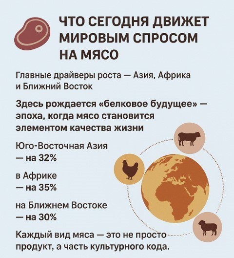 #Рыноквцифрах Культура потребления и маркетинг вкуса 🍖Что сегодня движет мировым спросом на мясо? Главные драйверы роста - Азия, Африка и Ближний Восток. Здесь рождается «белковое будущее» - эпоха, когда мясо становится элементом качества жизни. За 10 лет потребление выросло: 📈 в Юго-Восточной Азии - на 32%, 📈 в Африке - на 35%, 📈 на Ближнем Востоке - на 30%. Каждый вид мяса - это не просто продукт, а часть культурного кода: 🐓 мясо птицы - массовое и халяльное; 🐖 свинина - возвращает позиции после АЧС; 🐄 говядина - символ престижа и сегмента HoReCa; 🐏 баранина - часть традиций Африки и Востока. Потребитель становится требовательным: он хочет знать происхождение мяса, стандарты и экологичность. Мир переходит от простого насыщения белком к осознанному выбору качественного и безопасного продукта. Маркетинг мяса превращается в маркетинг доверия, где ценность строится на прозрачности и происхождении. @savkina #аналитикарынкамяса