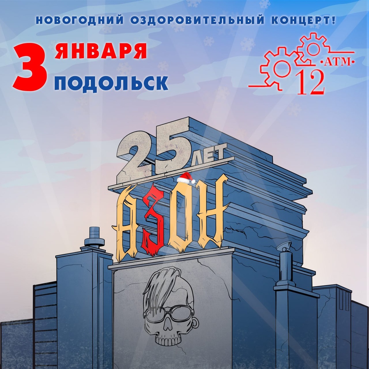 Москва и Область! Врываемся в Новый год весело и в отличной компании! Встречаемся 3 января на оздоровительном новогоднем концерте группы Азон в клубе «12АТМ», г. Подольск (всего 40 минут от Столицы)! Первые 10 билетов по 900 руб (двойные по 1600): https://www.az0n.ru/bilety-03-01-2026-podolsk-12atm-25-let-gruppe/ Уже традиционно соберёмся в самом начале года, поправим здоровье ломовой дозой позитива и зарядимся бодряком на весь год! Разумеется, повторим столичный разнос, ну и не обойдётся без совершенно неожиданных сюрпризов! Итак, 3.01.2026, 19:00, клуб «12АТМ», Адрес: Моск. обл., Подольск, ул. Рабочая, 5В