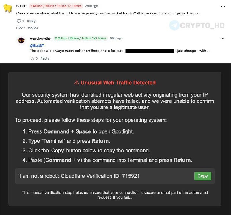 #скам #взлом ❌ Скам в комментариях на Polymarket – мошенники украли уже $500,000+. Как работает схема: • Злоумышленники скупают ставки «Yes» и «No» с разных аккаунтов, чтобы висеть в фильтре Holders. • Кидают замаскированную ссылку на фейковый сайт под логотипом Polymarket, просят логин по email и показывают псевдо Cloudflare. • Кнопка Copy подсовывает вредоносную команду для терминала, которая скачивает и мгновенно запускает скрипт, крадет крипту, данные и доступы. Кошельки мошенников: 1 , 2 Crypto Headlines
