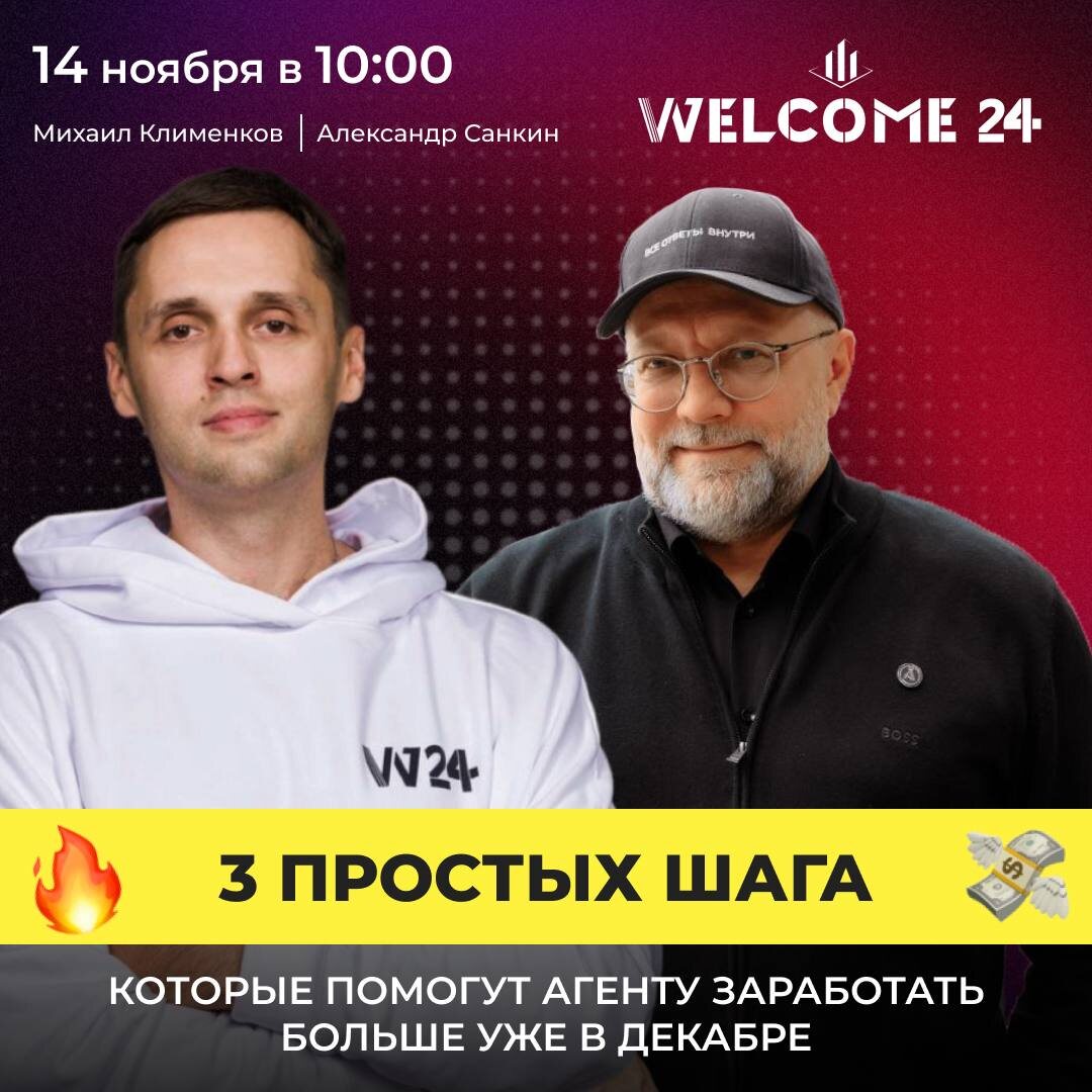 Хочешь закрыть этот год не выжатым, а с прибылью и удовольствием? Уже в эту пятницу мы соберёмся на вебинаре, где СЕО WELCOME 24 Михаил Клименков и автор аукционного метода продаж Александр Санкин зарядят мотивацией и расскажут: 3 простых шага, которые помогут агенту заработать больше уже в декабре 🔥 Поговорим о том, что реально работает на рынке недвижимости прямо сейчас 📅 Когда: 14.11 в 10:00 📍Ссылку на подключение оставим перед началом Если ты хочешь закрыть год красиво, обязательно будь на вебинаре!