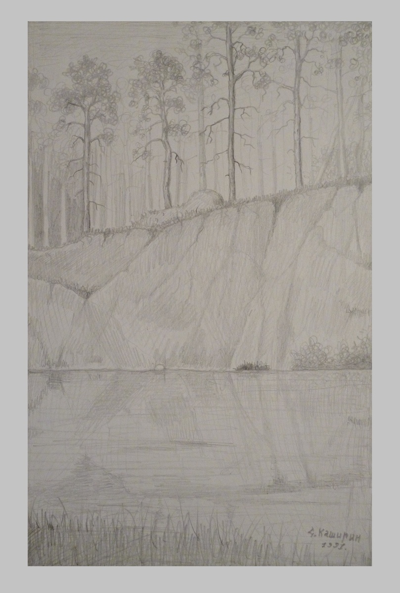 Очень красивый берег с соснами, когда увидел это место, то сразу захотел его написать. Это графика, а была ещё картина маслом. Помню как работал на природе с этюдником и писал это место. Комаров не было, счастье неописуемое. Конечно читается смешно, но это ведь правда, попробуйте работать когда Вас атакует туча комаров, особенно несколько часов. Вот поэтому и писал до самого вечера. Природа очень красивая там, именно в тех краях я увидел впервые в жизни больших улиток.