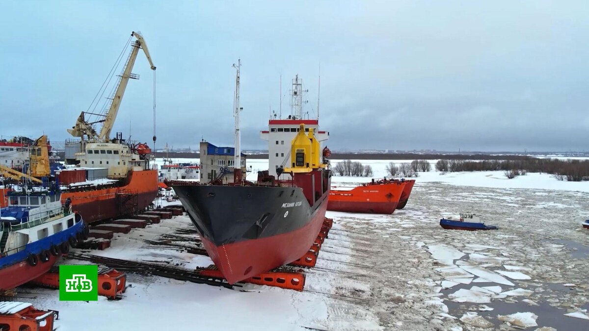 Чтобы установить судно на слип, его нужно сначала поднять из воды. И делают это с помощью специальных косяковых телег. Здесь важна ширина корабля или сухогруза. Например, в прошлом году здесь смогли поднять баржу шириной в 24 с половиной метра, которая перевозит грузы на семь с половиной тысяч тонн. И для северных морей это был рекорд.