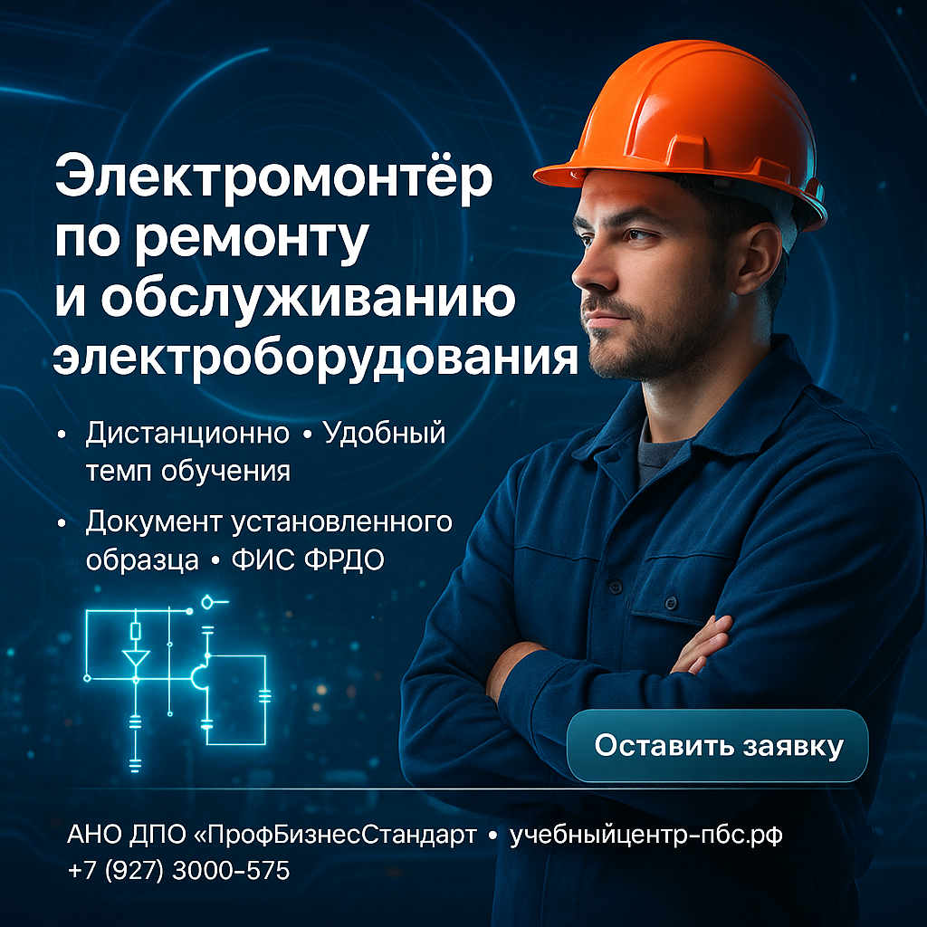 ⚡️ Электромонтёр по ремонту и обслуживанию электрооборудования — дистанционное обучение с документом установленного образца (ФИС ФРДО) Надёжная, востребованная и понятная профессия для тех, кто хочет стабильного дохода и понятный рост. Обучаем по лицензии, занятия — дистанционно в удобное для вас время через СДО. Кому подойдёт курс: