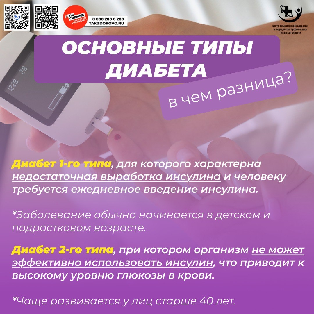 Неделя борьбы с диабетом: в чём разница между основными типами? 🩺 Всемирный день борьбы с диабетом (14 ноября) — отличный повод разобраться, какие же бывают формы этого заболевания. Часто путают диабет 1-го и 2-го типа, а это совершенно разные болезни. Смотри карточку⬆️ Главное: Диабет 1-го типа нельзя предотвратить, а риск развития диабета 2-го типа можно значительно снизить с помощью здорового образа жизни! Знание — это первый шаг к профилактике и правильному отношению к болезни. Поделитесь этим постом, чтобы больше людей понимали разницу! #деньборьбысдиабетом #диабет #типыдиабета #диабет1типа #диабет2типа #гестационныйдиабет #здоровоебудущее #ЗдоровоеБудущее62 #ЗдороваяРязань