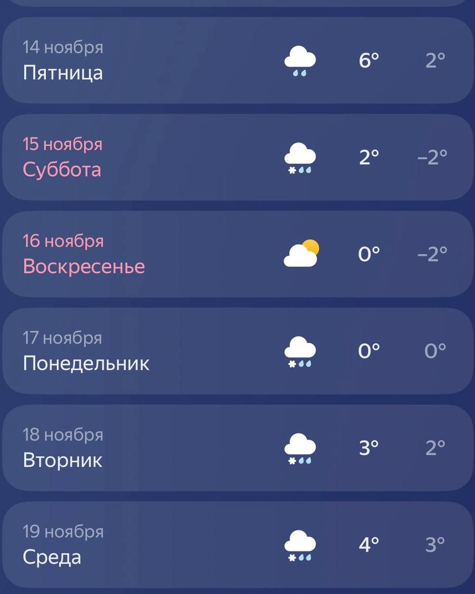 Первый снежочек ждем уже в эту субботу При этом дневная температура сохранится положительной — до +2 градусов. Снежный покров будет неустойчивым: выпавший снег может таять в течение дня. Ночные температуры опустятся до -1...-3 градусов. Автомобилистам следует быть внимательнее на дорогах