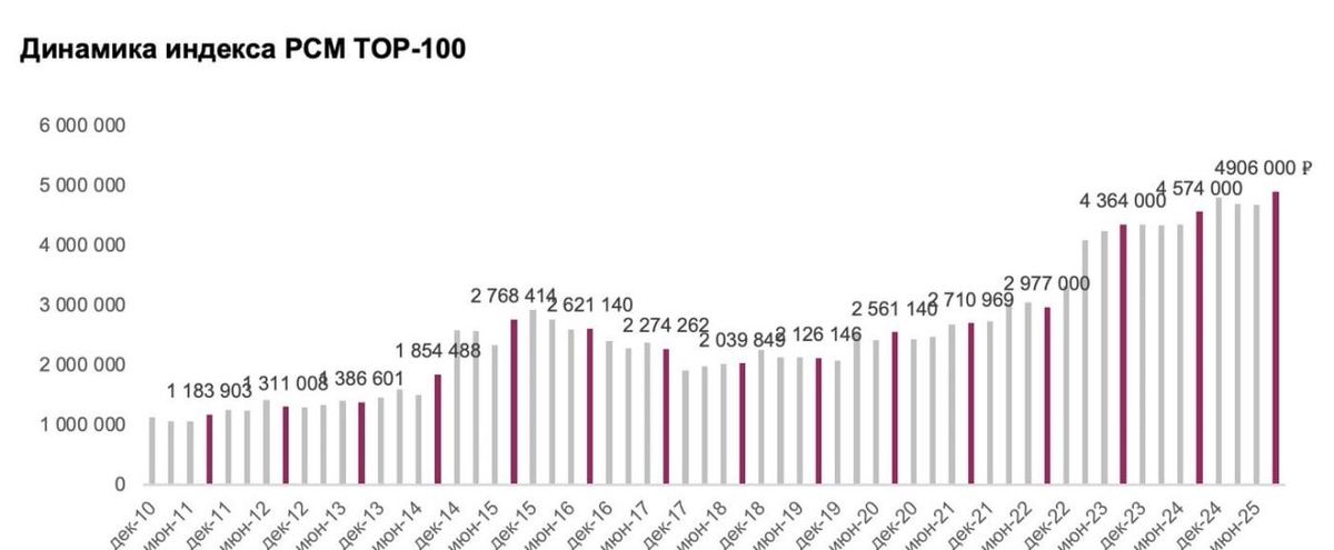 🪖 Средняя цена 1 м² в сотне самых дорогих квартир Москвы впервые достигла 4,9 млн ₽ — РБК Согласно индексу PCM TOP-100, показатель вырос на 7% за год и почти вдвое — за последние пять лет. Общая стоимость сотни элитных квартир столицы оценивается в 144 млрд ₽. 🔵 В структуре рейтинга: — 73% квартир — в новостройках, — 27% — на вторичке. Средняя площадь лота составляет 294 м², а 22% объектов — пентхаусы.