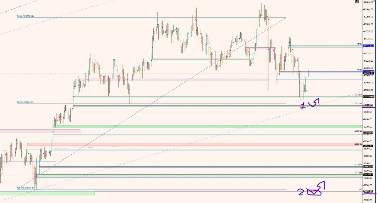 📉 График Биткойна На графике — два важных уровня, по которым мы ещё не дотестировали усилия. Тесты этих уровней непременно состоятся: 1️⃣ Первый уровень — есть шанс дотестировать до начала волны глобального снижения. 2️⃣ Второй — вероятно, будет протестирован уже по дороге вниз, после перехая и отработки цели по модели. Стоит внимательно следить за тем, как и когда свои цели выполнят индексы SP и Nikkei — я писал о них в постах выше. 📊 Отработка цели любого из этих индексов станет для меня сигналом закрыть позиции и ожидать большую коррекцию — со всеми ужасами, о которых аналитики говорят последние пару лет. Ведь даже стоячие часы дважды в день показывают правильное время 😄 Не ИИР