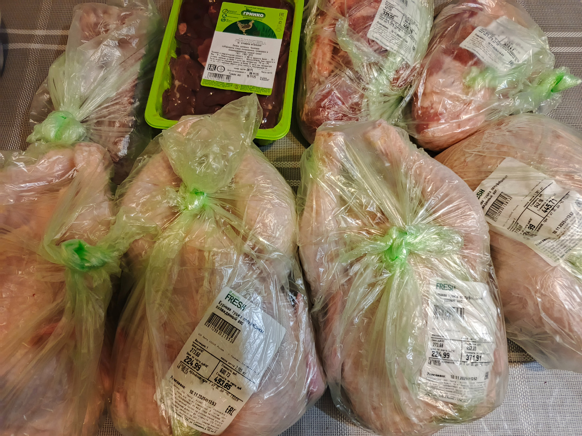 Здравствуйте! Как вы, наверное, заметили, заказы из магазина Лента практически полностью ушли из моих закупок. Раньше именно этот магазин рассматривался в первую очередь. Потом Ашан успешно стал альтернативой, и из Ашана мы заказываем доставку чаще всего. Сначала мне показалось, что в Ленте все-таки дороже, а на закупках я привыкла экономить. Потом мне как-то привезли зараженное жучками пшено, чего я не заметила сразу. Потом претерпела немало "приятных" минут в попытках спасти запасы. Качество продуктов в нашей Ленте не всегда хорошо, бывают и разочарования. Не обошлось без них и в этот раз. Впрочем, выбор пал на этот магазин, благодаря промокоду из Купера. За заказ в определенные часы доставки давалась скидка в 500 рублей, а других вариантов сэкономить не было. Показываю, что купили на этот раз, уже с итоговой ценой с применением промокода и списанием баллов от Сбера. Целью было, прежде всего, закупить мяска, все остальное товары текущего потребления. К курице претензий нет. На данны