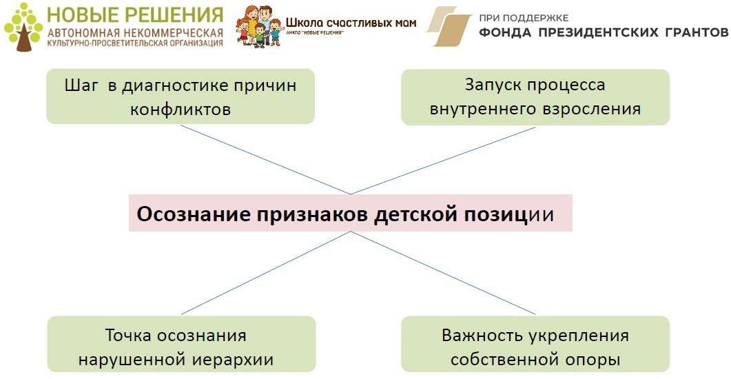 ✅В понедельник состоялось очередное занятие в Школе счастливых мам на тему «Из какой позиции мы решаем конфликты с детьми?» 💪В начале вебинара обсудили опыт достижений в группах. Рассмотрели примеры из чатов разных наставников. Узнать что-то новое – хорошо, но недостаточно. Важно включить знание в действие, это дает опыт изменений, который я присваиваю как мама. 🙇♀️Родители нередко просто воспроизводят шаблоны, которые дали им в детстве. Это приводит к эмоциональным качелям для ребенка, он не ощущает устойчивой опоры. Воспитание из детской позиции невозможно. 👉Признаки детской позиции: - Сложно решать проблемы; - Обижаемся и жалеем себя; - Чувство, что нас никто не слышит; - Отсутствие личных границ; - Неумение взять ответственность за свою жизнь. 💥Многие участники вебинара отметили, что находят у себя эти признаки: «Замечаю, что на 100% быть во взрослой позиции не получается». Осознание проявления детской позиции – это не тупик, а отправная точка, чтобы двигаться дальше. Само