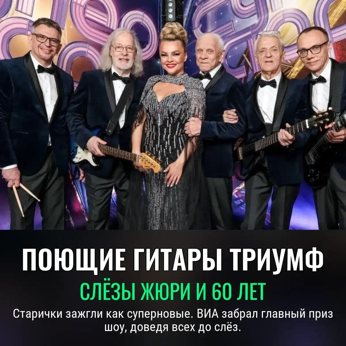 Суперстар на пенсии 🏆 Шоу «ВИА Суперстар!» закончилось скандально трогательно: престарелые «Поющие гитары» не только обошли всю глянцевую молодёжь, но и выжали из жюри слёзы – финальная «Я вернусь» стала хитом вечера. Судьи хранили тайну, но, видимо, не устояли перед ностальгией — 71 балл и первое место у ветеранов, которым скоро уже 60 (да, годовщина у ребят буквально через год). Остальные коллективы поплакали в сторонке: «Блестящие» и RevoльveRS едва дотянули до третьего места, а «Динамит» с «Лесоповалом» застряли на серебре. Победители признают, что улучшать есть что, но гордятся каждой морщиной и новым фанатом., Следите за новостями 📩