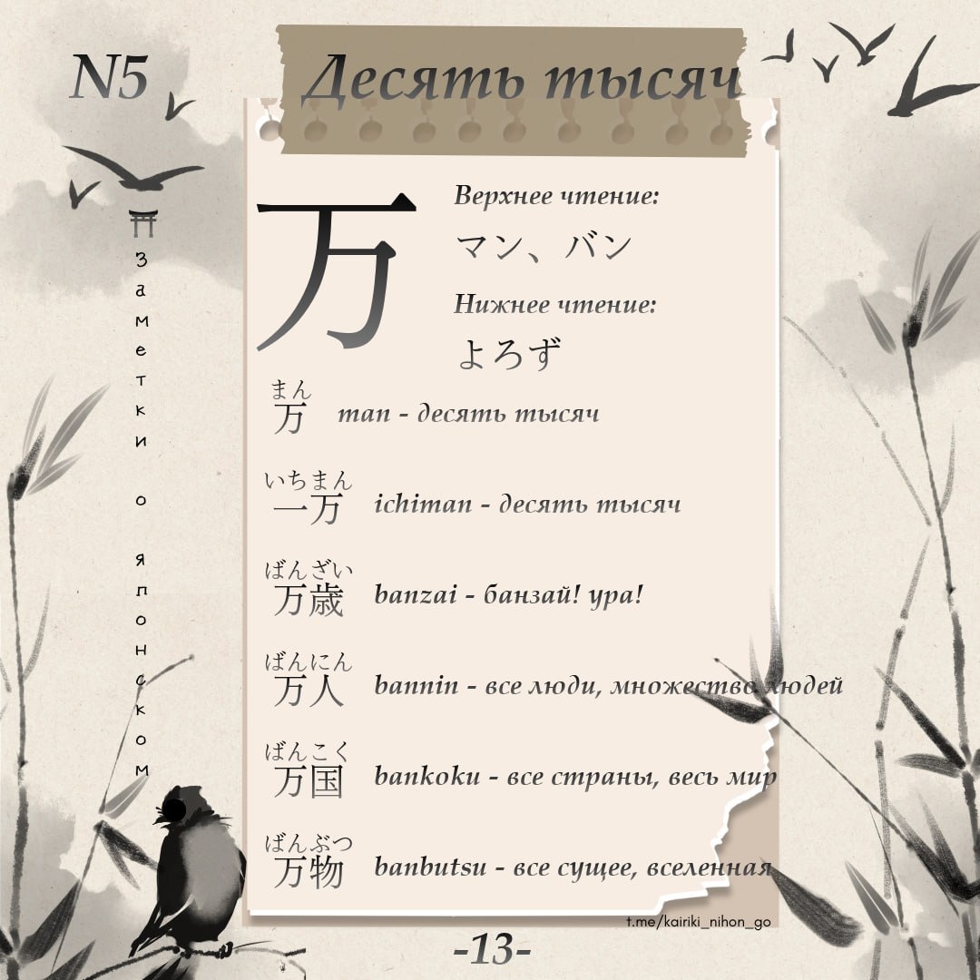 Заметка №13/2136 о 漢字 (кандзи) Итак, всем конничива! Сегодня будет небольшая заметка о кандзи [万] Означает: десять тысяч, тысячи, множество, весь, все. 🇨🇳 Китайское чтение, оно же онное: マン、バン 🇯🇵 Японское чтение или кунное: よろず Примеры слов с иероглифом [万]: 🎌 万 man - десять тысяч 🎌 一万 ichiman - десять тысяч 🎌 万歳 banzai - банзай! ура! 🎌 万人 bannin - все люди, множество людей 🎌 万国 bankoku - все страны, весь мир 🎌 万物 banbutsu - все сущее, вселенная Сохраняйте, чтобы собрать всю коллекцию 常用漢字 [кандзи для повседневного использования]! ⛩ Заметки о японском @nihongo #kanji #kanjiзаметка@kairiki_nihon_go