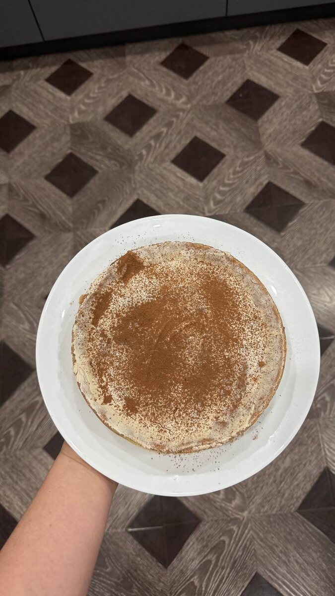 Блинный тортик «Тирамису» 〰️〰️〰️〰️〰️〰️〰️〰️〰️ для блинов: Яйца — 2 шт Мука - 100 гр Какао — 10 гр Молоко — 200 мл Кипяток — 50 мл Щепотка соли, ванилин, сах зам (можно сахар) для крема: Греческий йогурт - 150 гр Мягкий творог — 375 гр Кофе растворимый - 1 ч.ложка Кипяток - 30 мл Щепотка соли, сах зам (можно сахар) 〰️〰️〰️〰️〰️〰️〰️〰️〰️ Яйца взбейте с сахзамом, солью и ванилином. Я делала это просто венчиком. Добавьте муку и какао, перемешайте до однородности. Влейте молоко, затем кипяток. Жарьте на среднем огне с двух сторон до готовности. Для крема: Растворите кофе в кипятке, охладите. Взбейте творог, йогурт, сахзам и соль. Добавьте остывший кофе, продолжая взбивать до гладкости. Вырежьте из блинов одинаковые круги (можно с помощью тарелки, я делала через кондитерское кольцо). Промажьте каждый кремом, складывая стопкой. Верхний блин смажьте кремом, и украсьте какао. Убрать для пропитки на 2-3 часа. Я ставила на ночь. ⚪️⚪️⚪️⚪️⚪️⚪️⚪️⚪️⚪️ ⚪️⚪️⚪️⚪️⚪️⚪️⚪️⚪️🍃 ➖сохра