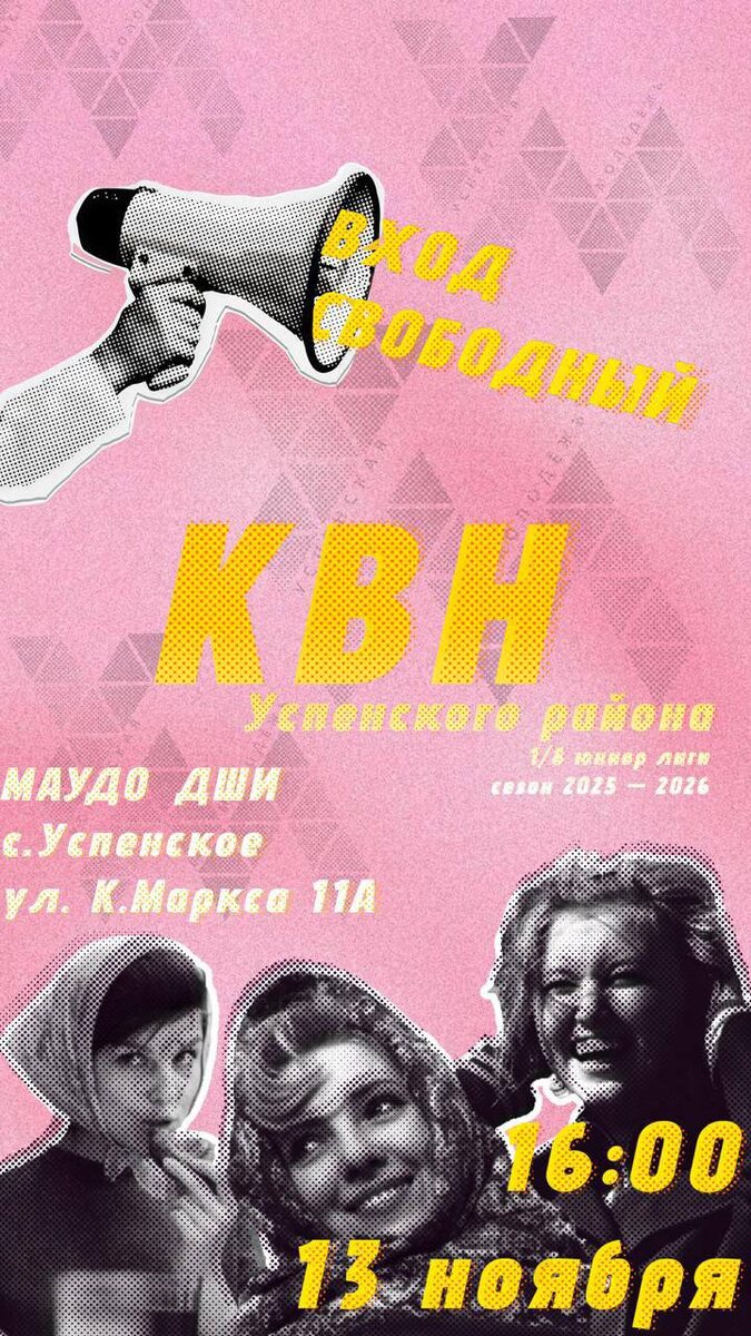 Уважаемые жители и гости Успенского района! 13 ноября 16:00 в детской школе искусств села Успенского состоится на 1/8 юниор лиги КВН Успенского района сезона 2025-2026☀️ https://ok.ru/group/70000041523919 https://vk.com/public212083585 https://t.me/rassvetusp - подпишись на СВОй "Рассвет".