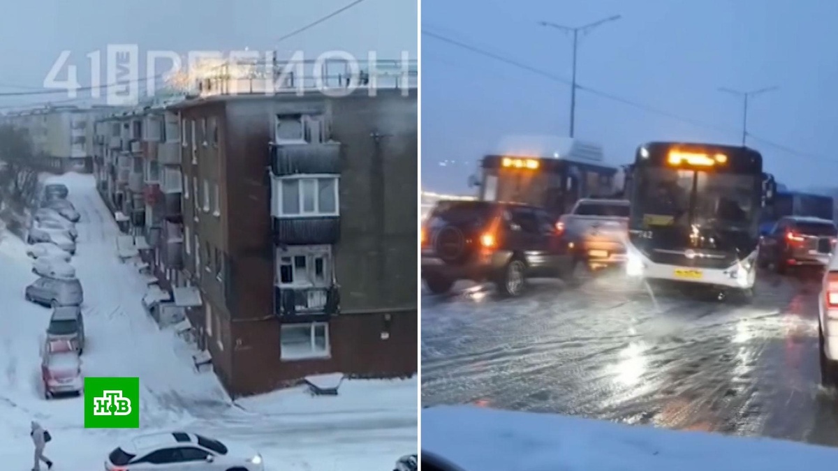 [ Смотреть видео на сайте НТВ ] На Камчатке мощный циклон принес штормовой ветер и сильные снегопады. Местные жители в соцсетях делятся кадрами непогоды. Мощный циклон обрушился на юг полуострова, там сильная вьюга, видимость снижена. Из-за скользких дорог Госавтоинспекция фиксирует многочисленные аварии. В некоторых районах Петропавловска-Камчатского — пробки. Водителей просят по возможности отказаться от использования личного транспорта. В регионе объявлено штормовое предупреждение и отменены занятия в школах. С перебоями работает аэропорт: некоторые рейсы задержаны, а самолеты, которые только подлетали, ушли на запасные аэродромы. Все спасательные службы переведены в режим повышенной готовности. [ Смотреть видео на сайте НТВ ]