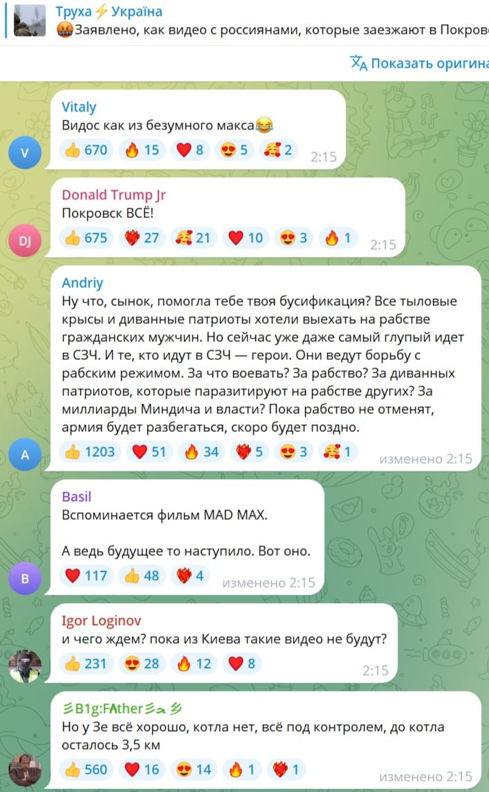 Это видео захода российских войск в Покровск облетело уже все украинские телеграм-каналы, а комментарии к нему соответствующие (переведены с